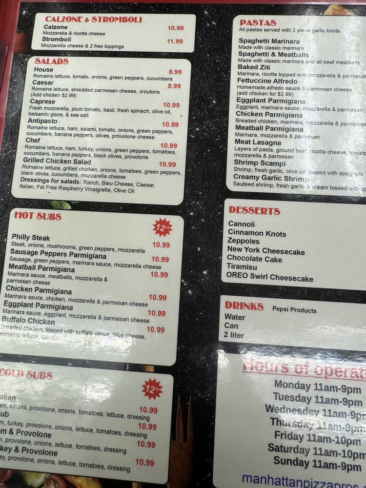 “ Being from the north east, we know NYC pizza real well! My son recommended this new pizza shop, and since Manhattans in the name will give it a shot. My husband and I walked in 3 o'clock on a Saturday afternoon we ordered three slices some garlic knots, and we were not disappointed at all. The pizza was thin, crusted super hot Largest pizza slices I've seen since Greenwich Village. We finished all three slices and one of the knots and then realized as we're looking through the menu that we need to take an eggplant Parmesan hero home. Well we walked out to the car looked at each other and said better eat half that Parmesan hero now don't want it to get cold , it was full of eggplant split open browned under the broiler, eggplants, peeled, sliced, thin. easy to eat. Bread was great. Small shop several tables inside you can eat with friends and family. The owner was very accommodating and friendly. Get the menu. Take it home. Use the coupons go here as often as possible. ”